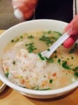 Clear broth soup made with rice, shrimp and white pepper. Soup is garnished with diced Chinese celery and served with homemade sauce.